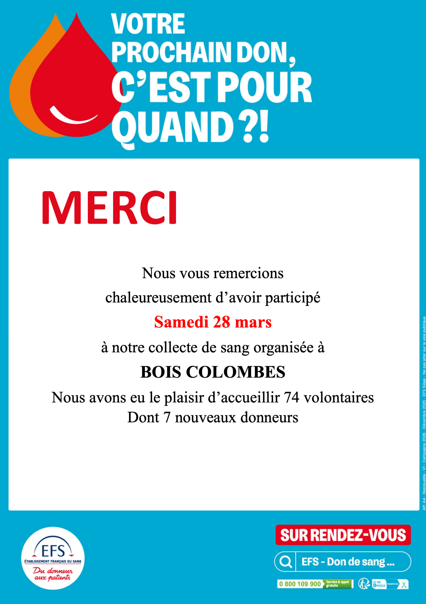 Réservez votre créneau : https://dondesang.efs.sante.fr/trouver-une-collecte/157828/tous?ville=BOIS%20COLOMBES