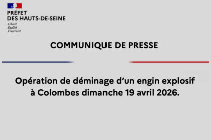 La Préfecture des Hauts-de-Seine a publié un communiqué de presse informant d’une opération de déminage d’un engin explosif à Colombes dimanche 19 avril 2026 en lien avec les services de la sécurité civile.