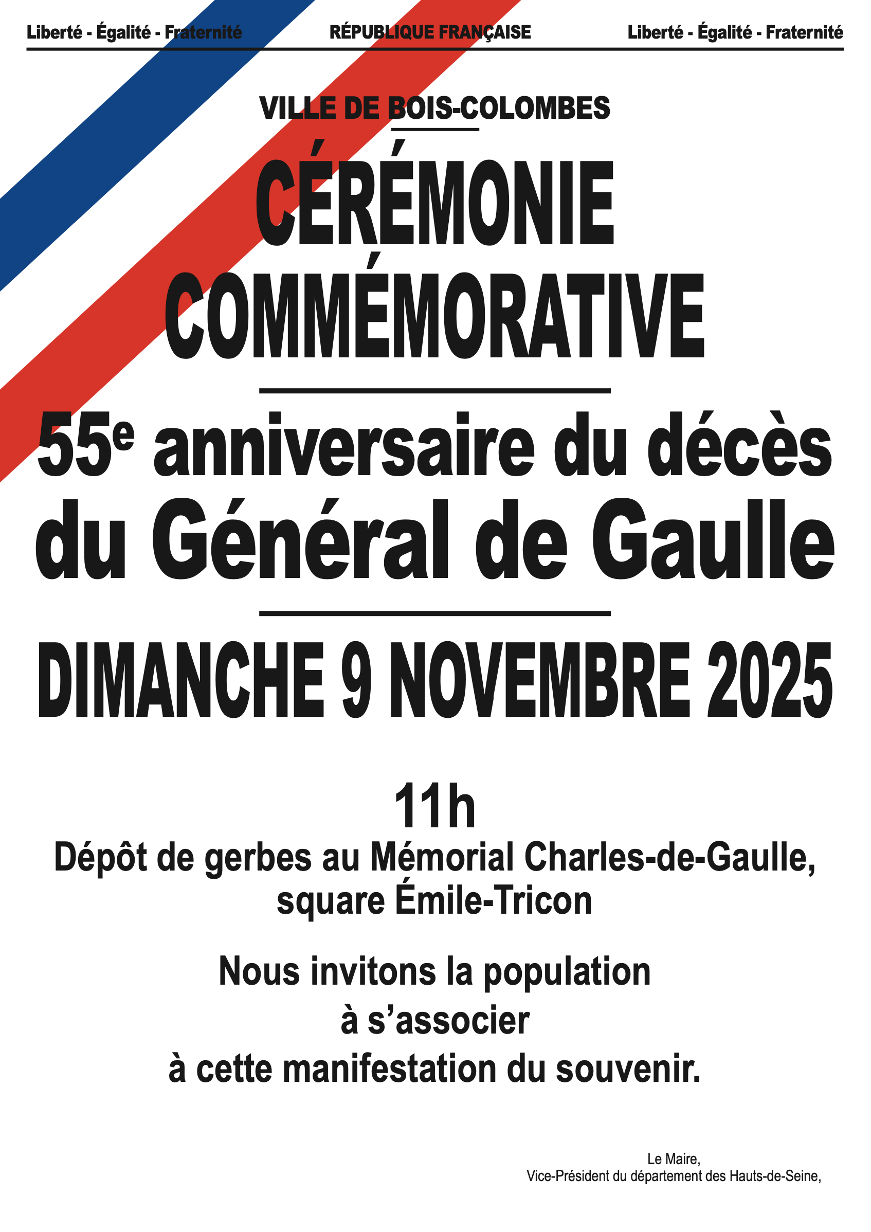 Dimanche 9 novembre à 11h aura lieu la cérémonie commémorative du 55e anniversaire du décès du Général de Gaulle.