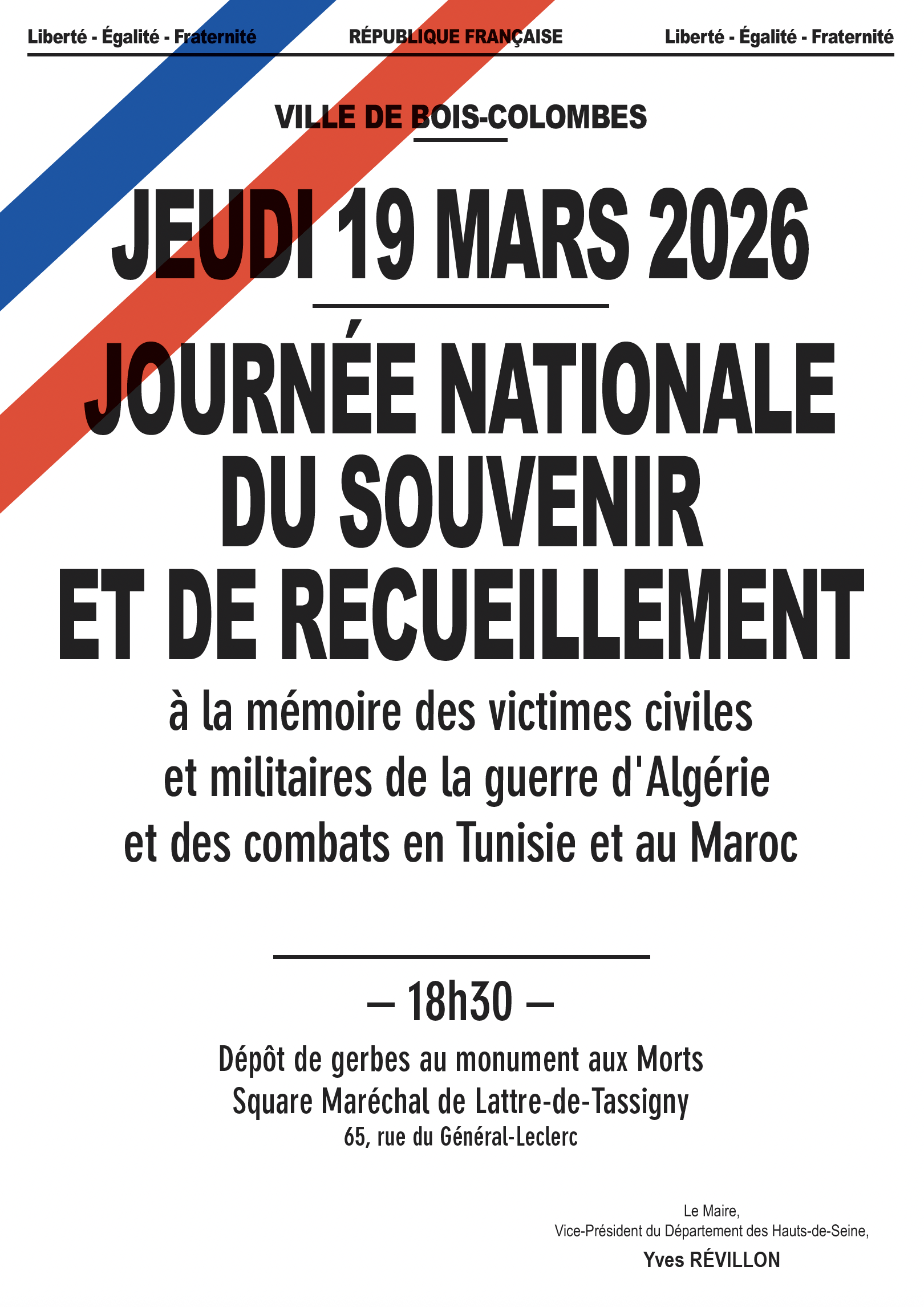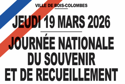 Jeudi 19 mars à 18h30 aura lieu la cérémonie pour la journée nationale du souvenir et du recueillement à la mémoire des victimes civiles et militaires de la guerre d’Algérie et des combats en Tunisie et au Maroc.