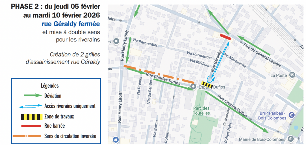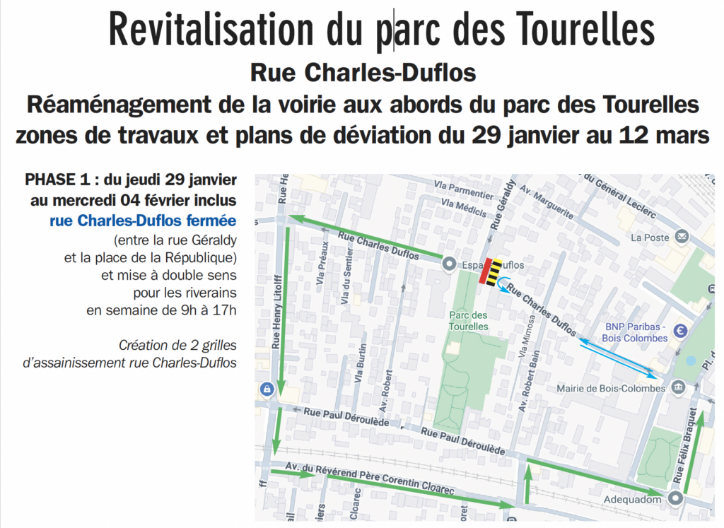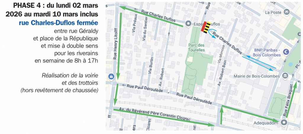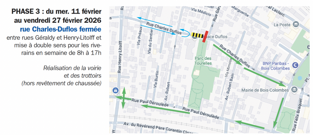 PHASE 1 : du jeudi 29 janvier au mercredi 4 février, la rue charles-Duflos est fermée de 9h à 17h entre la rue Geraldy et la place de la République.