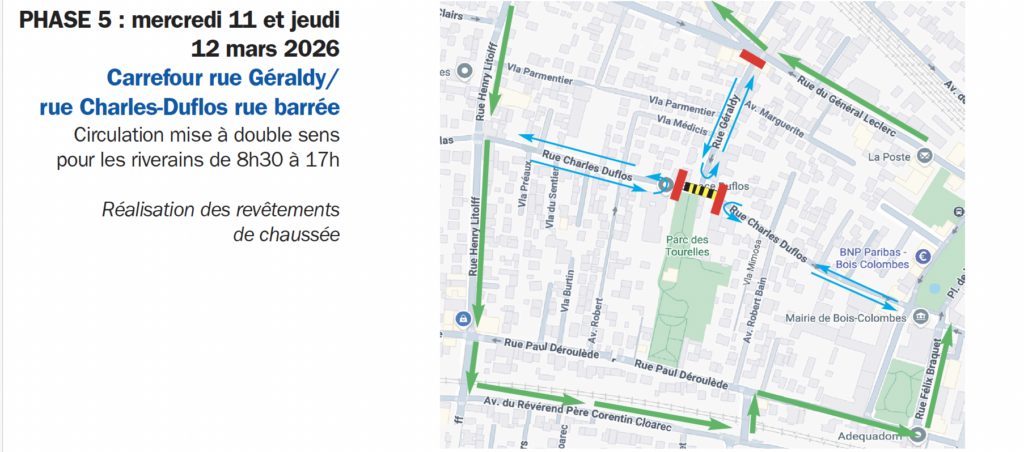 Des notifications ainsi que des SMS aux parents d’élèves des écoles concernées par les perturbations de circulation sont programmés pendant le durée des travaux. Les phases 3 et 4 auront lieu pendant les vacances scolaires : elles perturberont la circulation aux abords de l’espace Duflos et de l’école Paul-Bert lors des accueils de loisirs.