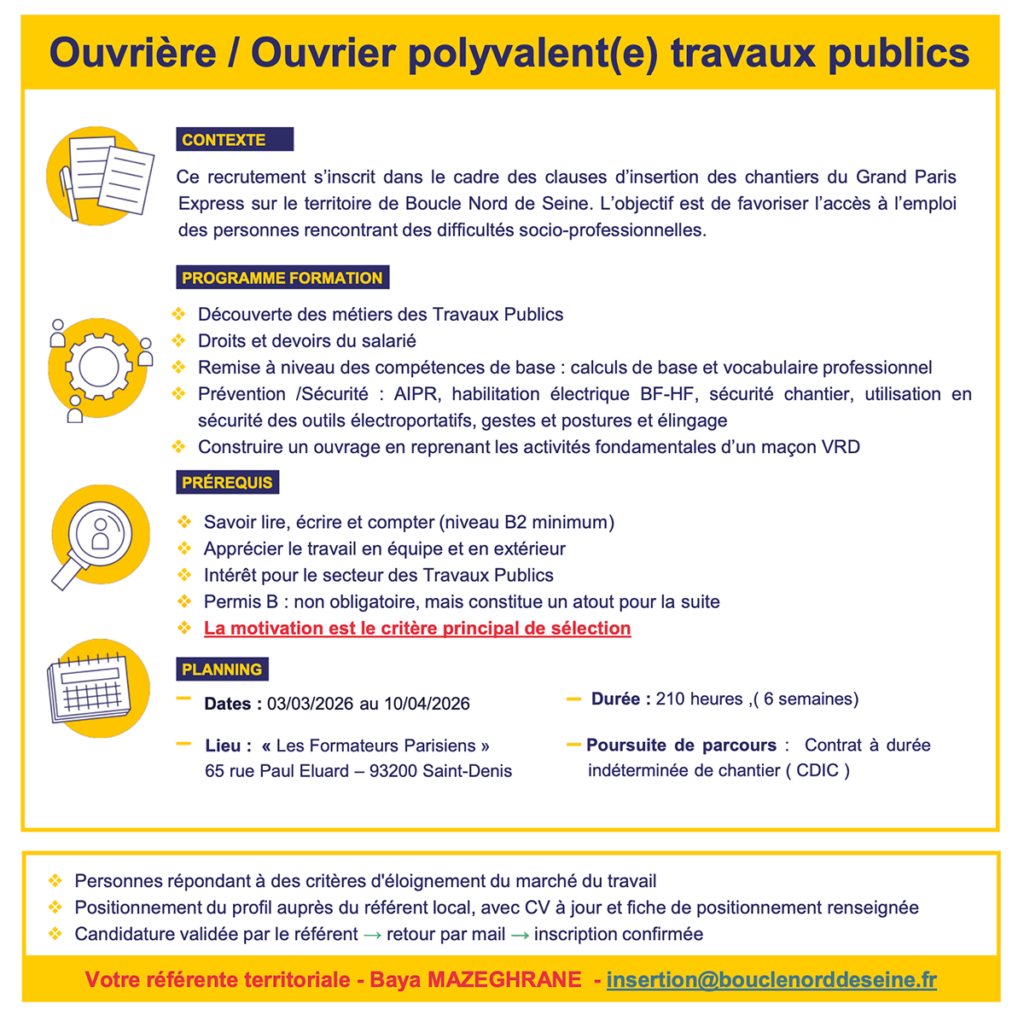 Ce recrutement s’inscrit dans le cadre des clauses d’insertion des chantiers du Grand Paris Express sur le territoire de Boucle Nord de Seine.