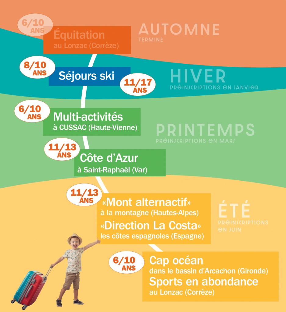Pour chaque période de vacances (sauf Noël), un dépliant SÉJOURS est élaboré, précisant les hébergements, encadrement et activités propres à chaque destination.
